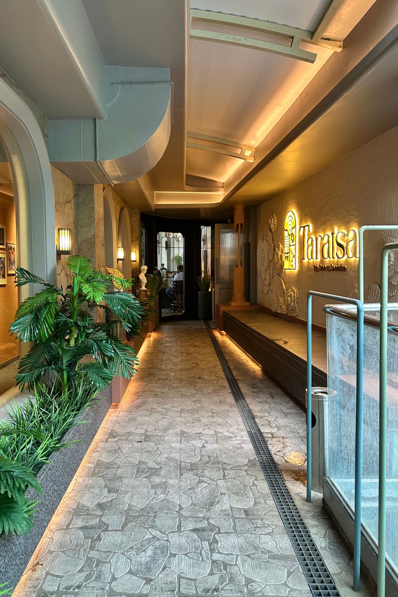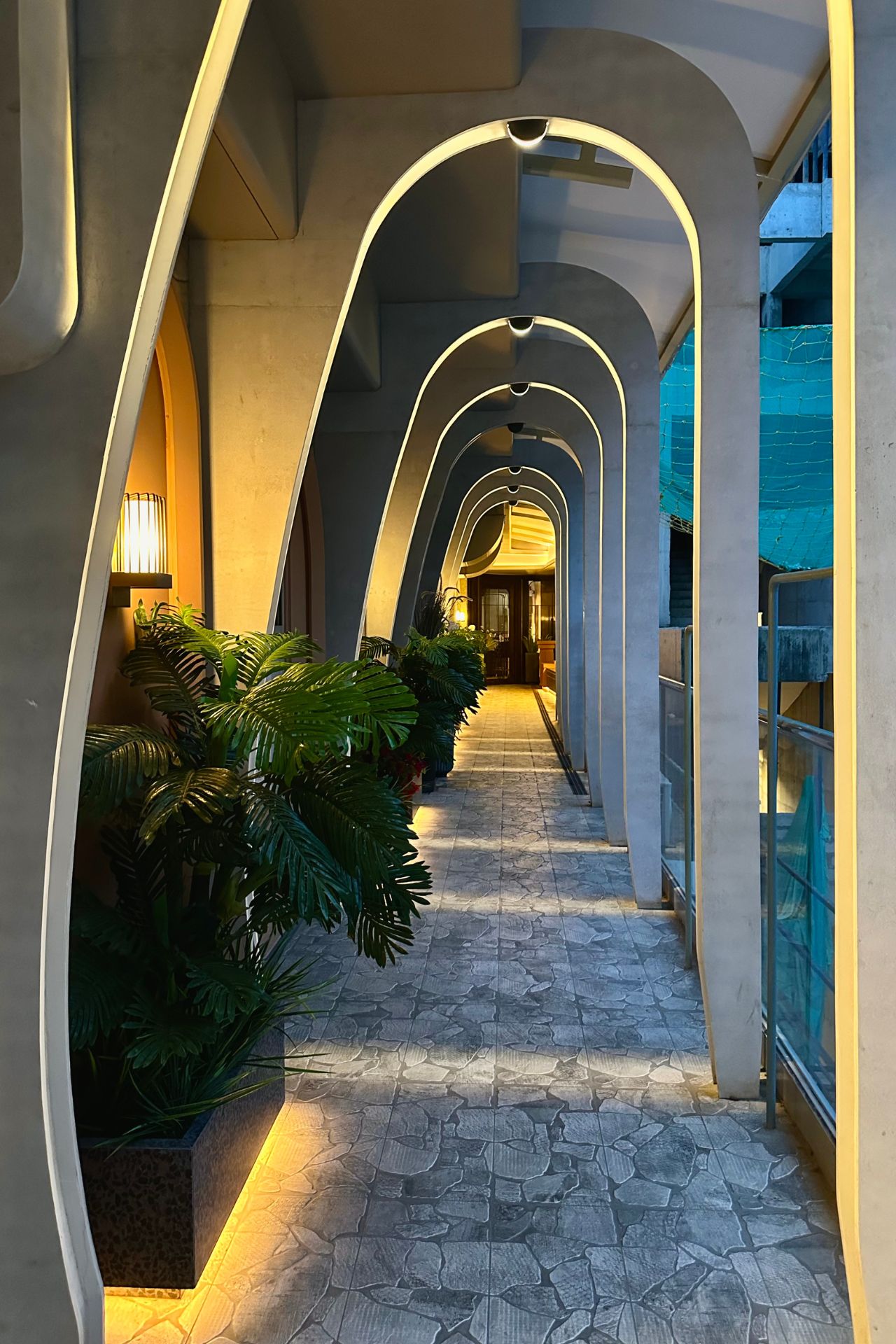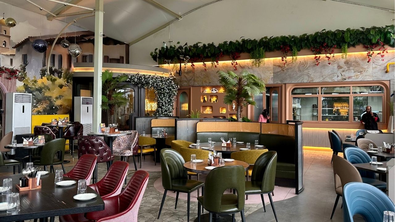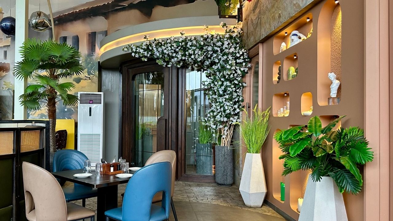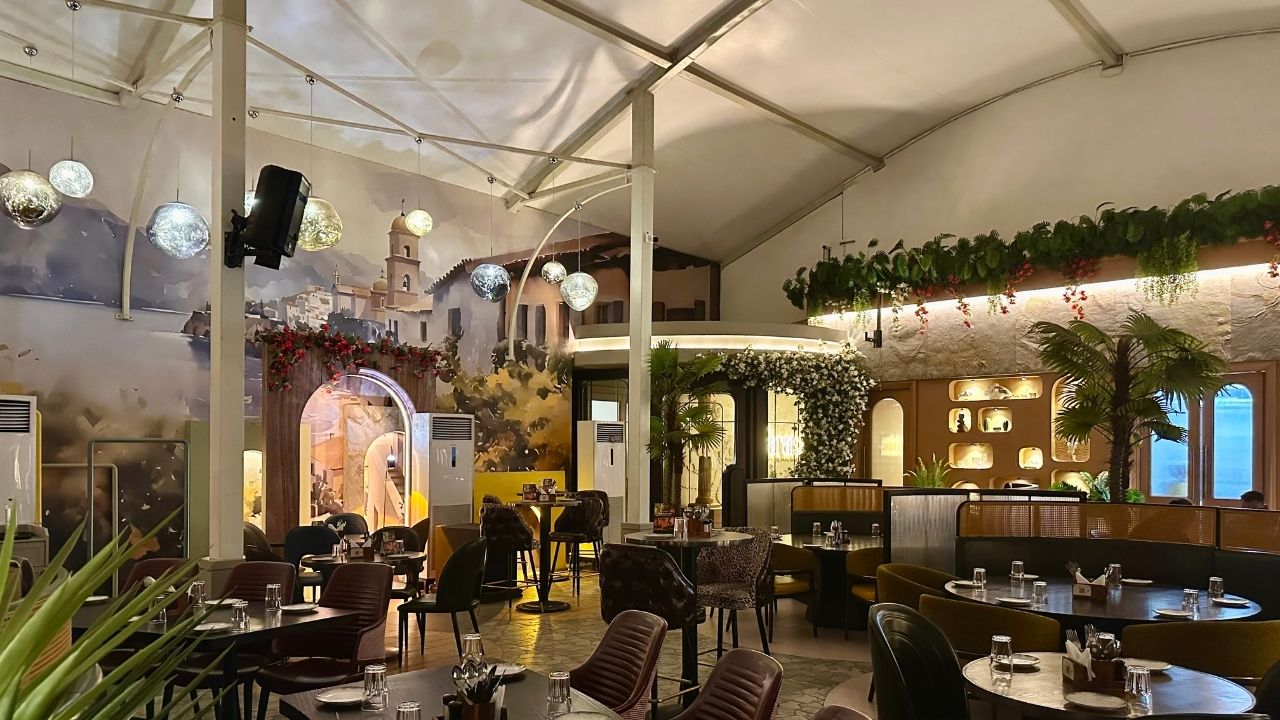 Stone-clad arches welcome guests at the entrance, setting the tone with architectural depth and character. The facade and structural elements carry the same material honesty, anchoring the space in a Mediterranean soul. To bring dynamism to the layout, we moved away from linear forms—introducing circular flooring patterns and soft spatial divisions that guide guests through the restaurant while offering a sense of intimacy at every table.