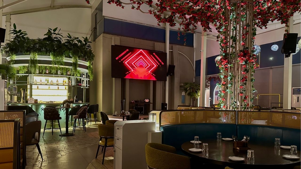 A circular bar, accompanied by a stage for live music and a massive LED panel screen, seamlessly transforming the atmosphere from a relaxed dining terrace into a lively sports bar or concert-like venue.
